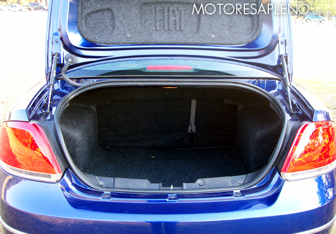 En el interior del maletero está ubicada la rueda de auxilio (con llanta de chapa), en el compartimiento especÃfico que se encuentra debajo de la alfombra. Los elementos para la eventual sustitución del neumático también están ubicados en el baúl. Otro dato interesante para señalar es que el maletero está totalmente tapizado, y el interior de la tapa del baúl, al igual que el capot, están forrados de un material insonoro. Las butacas, el asiento y el respaldo trasero, con formato antideslizante, están tapizados en pana (revestidos en Velour según especifica Fiat).