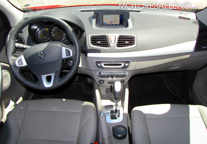 Sobre la parte superior del tablero, en el centro, está ubicado el navegador satelital integrado Carminat TomTom® (el Fluence es el primer vehÃculo fabricado en el MERCOSUR que lo trae) que ofrece mapas detallados y precisos en una gran pantalla de 5,8″, además de información visual de las limitaciones de velocidad, numerosos puntos de interés y múltiples posibilidades de personalización, que se programa desde un control remoto. Luego siguen los aireadores centrales, la tecla que acciona la baliza y el mando eléctrico del bloqueo y desbloqueo de puertas y baúl, y a continuación los de la climatización automática. Después se observa el sistema de audio 3D sound de Arkamys® y doble antena con conectividad Bluetooth, USB, CD y lector de MP3. El excelente sonido se emite mediante cuatro parlantes (uno en cada puerta) y cuatro tweeters (uno a ambos lados del tablero y los restantes en cada puerta trasera).