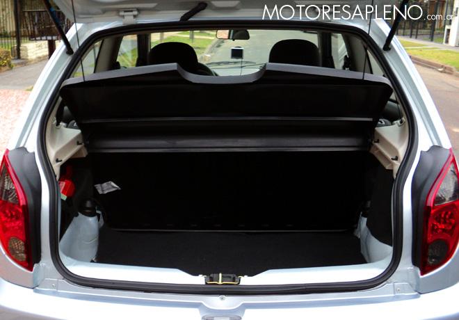 La capacidad del baúl es de 260 litros de volumen que puede ampliarse si se rebate el respaldo del asiento trasero (en forma entera). Dentro de este compartimiento, debajo de la alfombra, está la rueda de auxilio con llanta de chapa de 14 pulgadas, que tiene el neumático de la misma medida y marca de los que están en rodaje.