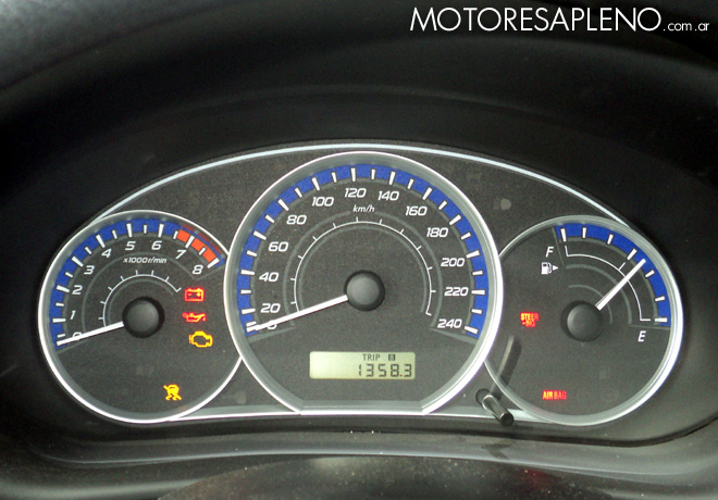 La plancha de instrumentos está compuesta por tres relojes analógicos circulares con fondo negro y números blancos, con escalas en azul, y además una zona roja en el tacómetro. En el centro se encuentra el de mayor tamaño y es el odómetro con cuentakilómetros total y parcial, y a ambos lados otros dos más pequeños: sobre la izquierda está ubicado el tacómetro del motor y hacia la derecha el marcador del nivel del depósito del combustible. Todo ello está complementado con numerosas luces testigos que alertan sobre la presión de aceite del motor; la carga de la baterÃa; cinturones de seguridad; airbag; ABS; tracción en las cuatro ruedas, etc. Hay que destacar que no cuenta con reloj marcador de temperatura del lÃquido refrigerante del motor. El mismo es digital, y según sea la temperatura el color puede variar de azul (indica que el impulsor no se ha calentado lo suficiente) a rojo (parpadea cuando el motor está próximo a calentarse, y queda permanentemente encendido cuando señala que éste se ha sobrecalentado y deberá detenerse).