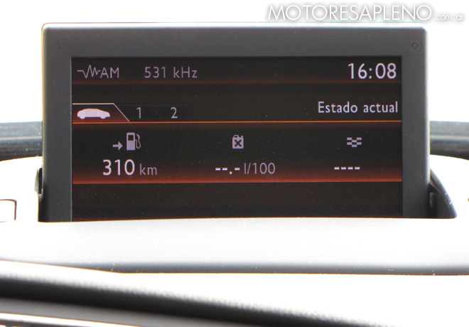 En la parte superior del tablero hay una pequeña pantalla virtual que señala la velocidad del vehÃculo, que es muy práctica ya que evita que el conductor tenga que bajar la vista del camino para controlarla, y otros datos que hacen a la función del auto. Hacia el centro se encuentra la pantalla multifunción a color, que es retráctil (con navegador satelital), y proporciona datos como dÃa y hora; temperatura exterior; mensajes de alerta; funciones de audio; ordenador de a bordo, etc. Y hacia abajo hay otros dos aireadores direccionales de la climatización, seguidos del sistema de audio y telemática (cuenta con 6 parlantes: uno en cada puerta y dos en la parte superior del tablero), y de tres selectores para la pantalla virtual; otro de señal de balizas, y por último el del cierre centralizado. Luego están los mandos de la calefacción y el aire acondicionado automático, y sobre la derecha la restante boca de desempañado del cristal lateral y el aireador de la climatización; el airbag para el acompañante y la pequeña guantera con iluminación pero sin llave, en cuyo interior está el sistema para activar/desactivar el airbag del acompañante.