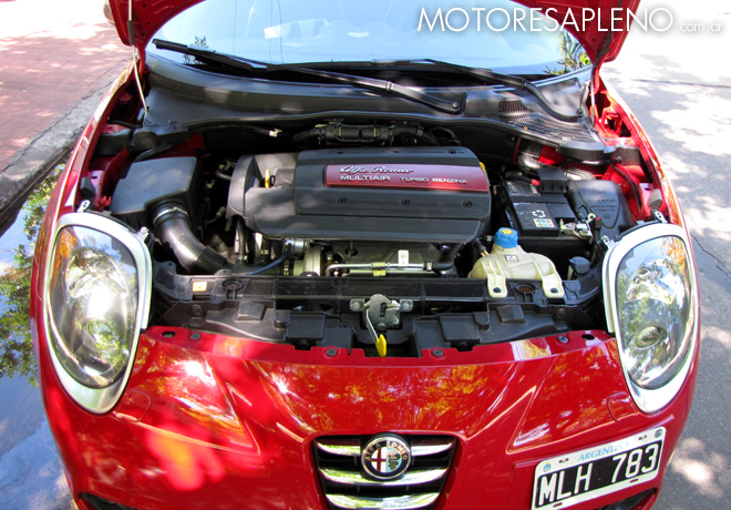 El MiTo que probamos tiene un motor naftero MultiAir (admisión electrónica) ubicado en posición delantera transversal, de 1.4L sobrealimentado con turbo; 4 cilindros y 16 válvulas. Tiene una potencia de 170 CV a 5.000 rpm. y un par máximo de 250 Nm a 2.500 rpm. Está asociado a una caja manual de 6 marchas, mientras que la tracción es delantera con diferencial electrónico Q2. Además cuenta con chapón protector del cárter.