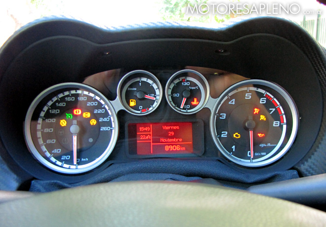 La plancha de instrumentos está compuesta por dos relojes analógicos circulares con fondo negro y detalles cromados, con números blancos bien legibles. Sobre la izquierda está el velocÃmetro y del lado derecho el marcador de las revoluciones del motor. Entre ambos está situada la pantalla multifunción con el cuentakilómetros total y parcial, temperatura exterior, hora, velocidad, mensajes de advertencia, intervalos de los servicios de mantenimiento, duración del trayecto, consumo medio y actual, autonomÃa, etc. Y arriba del display hay otros dos relojes circulares más pequeños al tono de los más grandes, con los indicadores de la temperatura del lÃquido refrigerante del motor y el nivel del depósito del combustible. Todo ello está complementado con diversas luces testigos relacionadas con la presión de aceite del motor, la carga de la baterÃa, detector de puertas abiertas, airbag, etc.