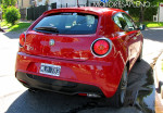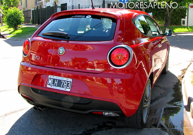 En cuanto al sector posterior, el portón tiene un alerón en la parte superior donde también está ubicada la tercera luz de stop. En el centro está el logo de Alfa Romeo, desde donde también se puede abrir, oprimiéndolo, además de la apertura a distancia desde la llave de contacto. Sobre la izquierda, en la parte inferior, está la identificación del modelo (MiTo). Los faroles traseros son circulares y de logrado diseño, con luces LED. El paragolpes envolvente tiene un aplique en el centro de tono negro y también los sensores de estacionamiento; la luz de marcha atrás y las antiniebla. La doble salida de escape está cromada, y todo este deportivo diseño exterior le permite al MiTo tener un excelente coeficiente aerodinámico (CX 0,29)