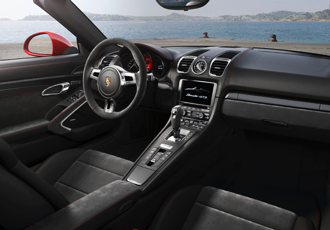 El Boxster GTS y Cayman GTS combinan excelentes dinámicas de conducción con la distribución típica de Porsche, sin disminuir el confort durante el viaje y con características exclusivas. Por ejemplo, la combinación del PASM y el paquete Sport Chrono como estándar permite al conductor cambiar entre el estilo deportivo progresivo, por una parte, y el confort en largas distancias, por otra parte, al pulsar un botón. Los neumáticos que miden 235/35 en la parte delantera y 265/35 en la parte trasera en las ruedas Carrera S de 20 pulgadas ofrecen el ajuste perfecto para ambos. Ambos modelos biplaza vienen con asientos deportivos e interiores en cuero como estándar. Al igual que otros modelos GTS de Porsche están refinados con elementos de Alcantara.