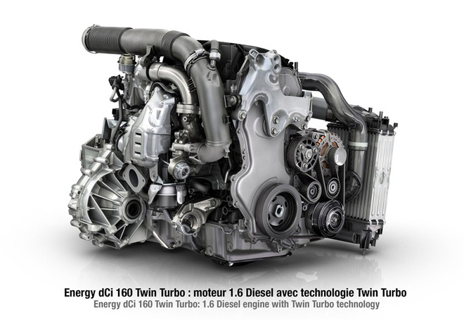 El nuevo motor diesel Energy dCi 160 Twin Turbo, que pone de relieve el downsizing y la doble sobrealimentación. Con una cilindrada de 1598 cm3, ofrece todo el placer de un motor de dos litros pero con un 25 % de consumo menos. Gracias a su rendimiento, este motor impulsará con eficacia vehículos de gran tamaño. Los futuros vehículos de los segmentos D y E también contarán con este motor.