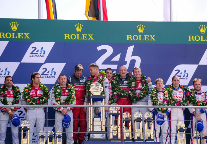 El Audi Nº 1 pilotado por Tom Kristensen, junto con Lucas di Grassi y Marc Gené, completó el «uno-dos» para la marca de los cuatro anillos. Hay que destacar que Gené logra un nuevo podio por cuarta vez en la mÃtica prueba de La Sarthe, como piloto de resistencia.