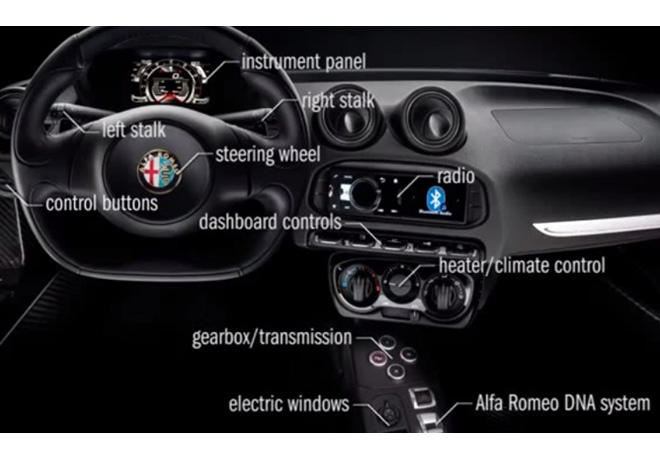 Cuenta con cuatro zonas interactivas que incluyen contenidos multimedia: una, dedicada al TCT permitiendo interactuar con los controles centrales de la caja, así como también acceder a un tutorial para aprender a utilizar la función “Launch Control”. La segunda zona de interactividad se encuentra en el exclusivo Alfa DNA, el selector de conducción patente de la automotriz italiana. La radio también se hace acreedora de otro punto y finalmente el cuarto se centra en el innovador panel de instrumentos TFT.
