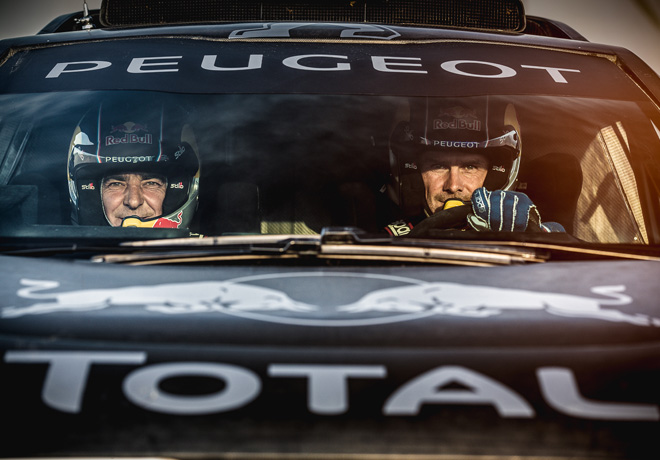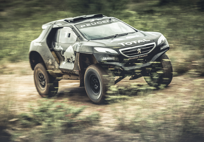 Los siguientes comentarios no hacen más que confirmar esta primera constatación: “Nunca había manejado un auto con tanto despeje de suspensión. La verdadera primera sorpresa reside en la manera en la que el Peugeot 2008 DKR absorbe los baches y las compresiones. Yo, que tengo la costumbre de exigirme como loco, descubro un comportamiento totalmente eficaz y con mucha untuosidad. Ahí donde uno duda de tomar un impacto, la suspensión y las ruedas de diámetro importante absorben. Es una buena sensación que permite pasar por baches a 120 ó 130 km/h en vez de a 80. Deberé adaptarme a mi estilo de pilotaje… ¡Sobre todo porque la bestia tiene temperamento! Las dos ruedas de tracción tienen un poco más de juego y requiere un pilotaje más fino. Es un poco menos fácil de controlar. Realmente siempre hay que estar al límite de la deriva. En cuanto al resto, el motor tiene un buen carácter, la caja de velocidades pasa bien… Todavía estamos lejos de las regulaciones óptimas, pero las primeras sensaciones son muy buenas: Hay mucho potencial”.
