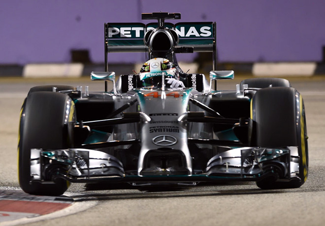 Lewis Hamilton con el Mercedes se quedó con la pole position para el Gran Premio de Singapur en el circuito Marina Bay en la última vuelta de la Q3, y le quitó el mejor tiempo a su compañero de equipo Nico Rosberg por sólo 7 milésimas. Mañana ambos entablarán una lucha particular por la victoria y el campeonato.