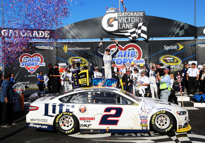 Brad Keselowski arrancó de la mejor manera la definición de la Caza por la Copa Sprint de NASCAR. Luego de 267 vueltas el piloto del Ford Fusion del Team Penske se impuso en la competencia disputada en el óvalo de Chicagoland de 1.5 millas, superando a Jeff Gordon (Chevrolet), quien quedó a 1”760 del vencedor.