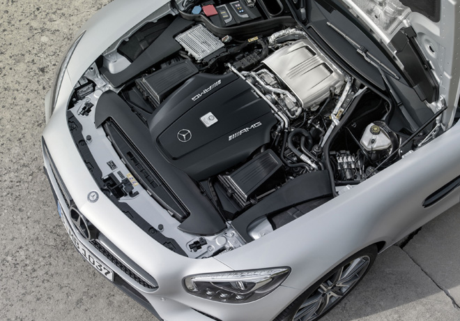 El motor AMG V8 biturbo de 4,0 litros, también de nuevo desarrollo, subraya la filosofía de la marca AMG. El primer motor con engrase por cárter seco y turbocompresor doble montado en la “V” interior de las bancadas que se incorpora en un vehículo deportivo está disponible en dos niveles de potencia: 340 kW (462 CV) en el modelo GT y 375 kW (510 CV) en el GT S. El nuevo GT conjuga el dinamismo de conducción y las prestaciones de un vehículo de competición con una elevada idoneidad para el uso diario, así como una eficiencia que define un nuevo estándar en su segmento.