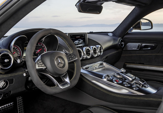 Hay que destacar que el GT S cuenta con un equipamiento más distinguido todavía, que incluye entre otros, el cuadro de instrumentos con escala ampliada a 360 km/h y elementos de color rojo; volante Performance forrado en napa negro/microfibra Dinamica; escudo AMG grabado en el apoyabrazos central (no en combinación con el tapizado en símil de cuero Artico/microfibra Dinamica negro) y tapizado en símil de cuero Artico/microfibra Dinamica negro.