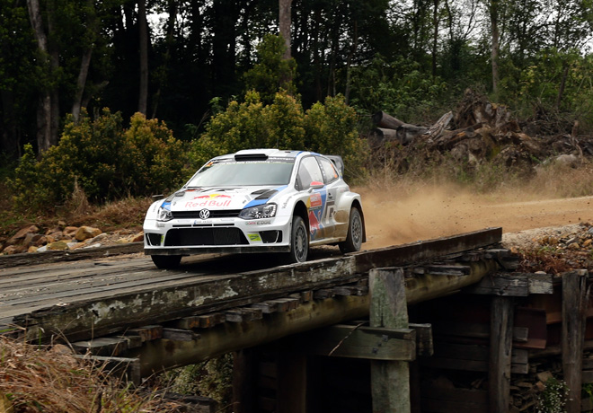 Sebastien Ogier con el Polo R WRC del Volkswagen Motorsport lidera el Rally de Australia por delante de su compañero de equipo Jari-Matti Latvala, a quien aventaja por 11.8 segundos después de haber superado al finlandés en los tramos de la tarde, cuando la amenaza de lluvia provocó diferentes estrategias en la utilización de neumáticos entre los principales pilotos. Y quien eligió en forma correcta sus neumáticos fue precisamente Ogier.