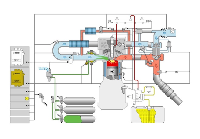 Bosch brinda un sistema completo de gestión del motor para aplicaciones de gas natural en el que la unidad de control electrónica es el principal componente, tanto para la operación monovalente como para la DualFuel.