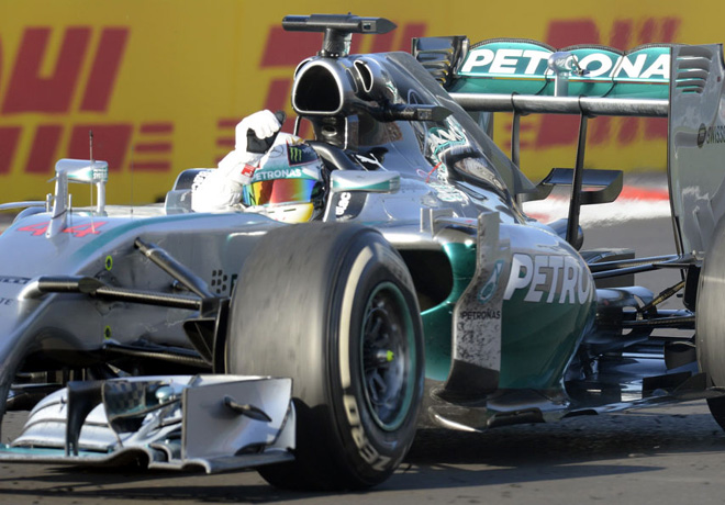 Además, la tarea de Hamilton se vio beneficiada cuando su compañero Rosberg intentó superarlo en la primera curva, y luego de una gran bloqueada de sus neumáticos y posterior salida de pista tuvo que ingresar a boxes para reemplazarlos.