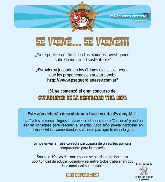 PSA Peugeot Citroën Argentina lanzó la 5ª edición de su programa “Guardianes de la Seguridad Vial”. Declarado de interés nacional por la Agencia Nacional de Seguridad Vial, que depende del Ministro de Interior y Transporte de la Nación, PSA Peugeot Citroën junto con Peugeot Argentina convoca a los estudiantes de escuelas primarias de todo el país a participar de un concurso sobre la seguridad vial.