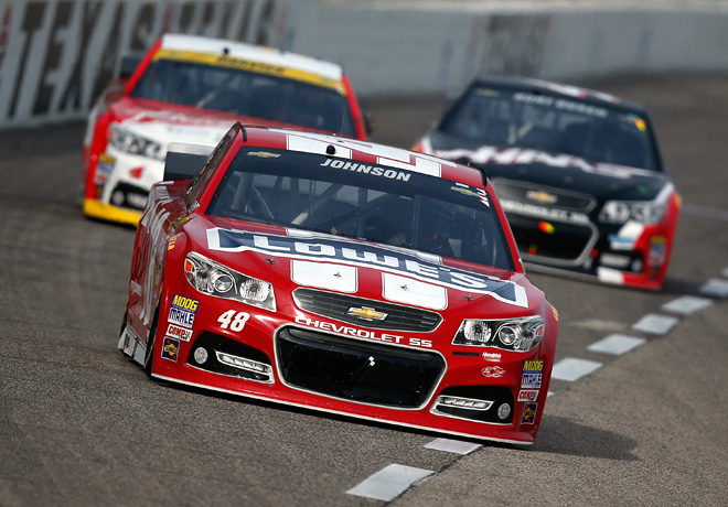 Jimmie Johnson (Chevrolet) contuvo los embates de Brad Keselowski (Ford) y Kevin Harvick (Chevrolet) en el segundo intento de un final de bandera verde-blanca a cuadros para ganar el el óvalo de Texas.