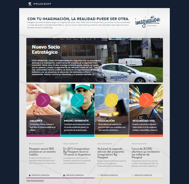 Peugeot Argentina estrenó una sección específica en su web oficial www.peugeot.com.ar destinada exclusivamente a #ImaginationByPeugeot, el programa de Responsabilidad Social Empresaria (RSE) que la automotriz francesa impulsa fuertemente a nivel local desde 2012.