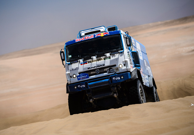 En camiones, ya con cinco victorias tras haberse disputado ocho etapas, Eduard Nikolaev ha vuelto a demostrar en Iquique que no cabe la más mÃnima duda: es el más rápido en la pista al volante de su Kamaz. Obtiene esta quinta victoria con más de once minutos sobre Gerard de Rooy, ventaja que lo catapulta hasta el tercer puesto de la clasificación general por detrás de sus compañeros de equipo Airat Mardeev y Andrey Karginov, aunque por el momento no supone ninguna presión