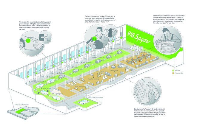 El acabado del cuero y las mesas de ensamblaje utilizadas en la producción del 918 establecen nuevos parámetros de ergonomía y flexibilidad. Por ejemplo, las partes intercambiables permiten que se fabriquen diferentes componentes, asegurando que el tiempo en la estación sea óptimo. Además, tanto la altura como el ángulo de las mesas se pueden ajustar de modo que correspondan a las necesidades de cada empleado.