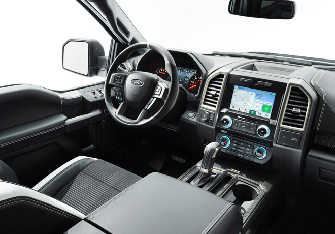 El diseño externo de la F-150 Raptor transmite una imagen de fuerza, mientras que el interior crea un ambiente confortable para que el conductor y los pasajeros disfruten sus momentos en el camino o fuera del él. El interior tiene terminaciones en tres opciones de colores y levas al volante para el control manual de la caja de cambios de 10 marchas.