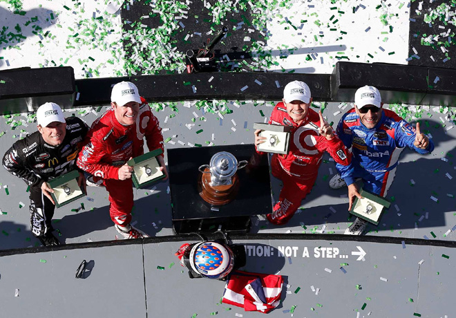 El campeón de la IndyCar en tres ocasiones, quien ganó por segunda vez en Daytona, fue acompañado por Kyle Larson, el Novato del Año de NASCAR, Jamie McMurray y Tony Kanaan.