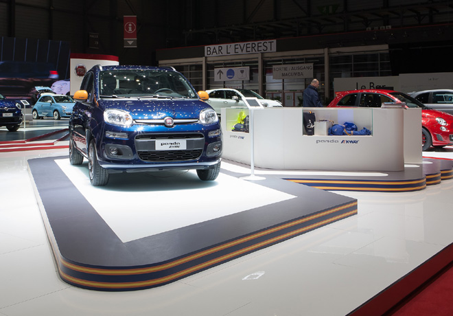 Los visitantes del Salón de Ginebra pueden admirar como novedad la nueva serie especial Panda K-Way® resultado de la colaboración entre Fiat y la marca de prendas impermeables por excelencia, casual y fashion. Dos marcas famosas en el mundo por sus productos clásicos, actuales, tecnológicos, funcionales, coloridos e inteligentes.