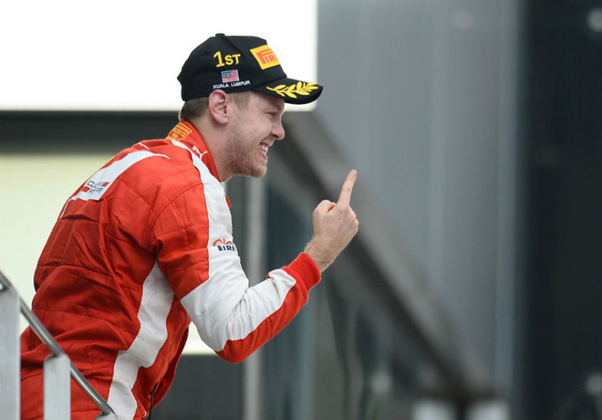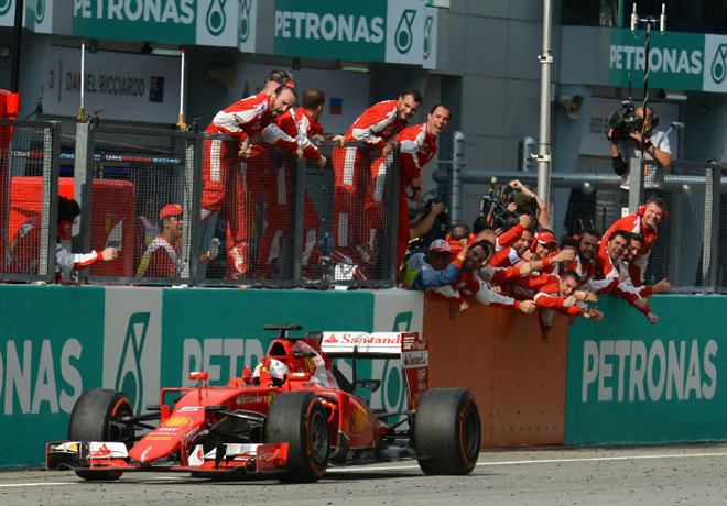 Después de casi dos años sin triunfos -el último había sido en el Gran Premio de España en 2013 con Fernando Alonso- volvió a ganar Ferrari. Y el héroe de los tifosi fue Sebastian Vettel, quien fue el vencedor del Gran Premio de Malasia en Sepang, después de una excelente estrategia del equipo de Maranello que diagramó para el alemán una parada menos -solamente dos- que las de sus perseguidores que debieron hacer tres.