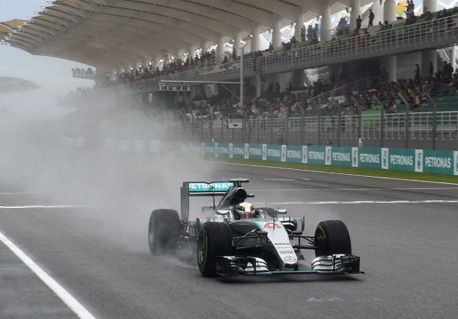Lewis Hamilton con su Mercedes logró la segunda pole de la temporada luego de la conseguida en Australia, relegando por 74 milésimas a la Ferrari de Sebastian Vettel y por 465/1000 al otro Mercedes de su compañero Nico Rosberg, en una sesión clasificatoria que estuvo dominada por la lluvia que llegó a mitad de la Q2 y produjo un retraso en la definitiva Q3, que se puso en marcha con la pista todavÃa húmeda.