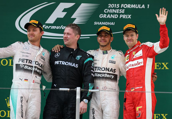 El británico Lewis Hamilton ganó el Gran Premio de China disputado en Shanghai, segunda victoria consecutiva, siendo su escolta Nico Rosberg. Tercero arribó Sebastian Vettel con la Ferrari y cuarto su compañero Kimi Räikkönen, en lo que los bólidos rojos parecen ser los más competitivos luego de los Mercedes, que todavía llevan una considerable ventaja técnica al resto.