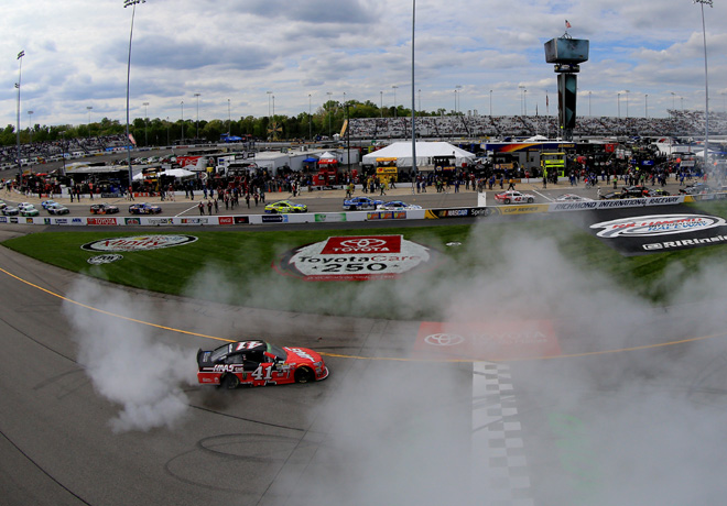 La Toyota Owners 400 estaba programada originalmente para el sábado en la noche, pero tuvo que ser pospuesta por lluvia.
