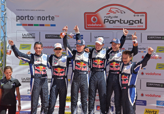 Jari-Matti Latvala fue el vencedor del Rally de Portugal, quinta prueba del campeonato, con su VW Polo R WRC, aventajando por 8,2 segundos a su compañero Sébastien Ogier. Completando un podio totalmente copado por VW Motorsport, arribó tercero Andreas Mikkelsen, quien terminó a 28.6 segundos del vencedor, estrenando la versión 2015 del Polo R WRC. Hay que destacar que Ogier venció en el Power Stage; Latvala fue segundo y Mikkelsen tercero.