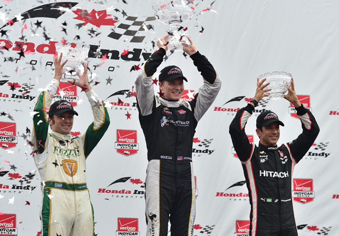 Tercero arribó Helio Castroneves y cuarto su compañero en el equipo Penske Will Power, quien habÃa hecho la pole position, mientras que el vencedor el año pasado en Toronto, Sebastien Bourdais, fue quinto.