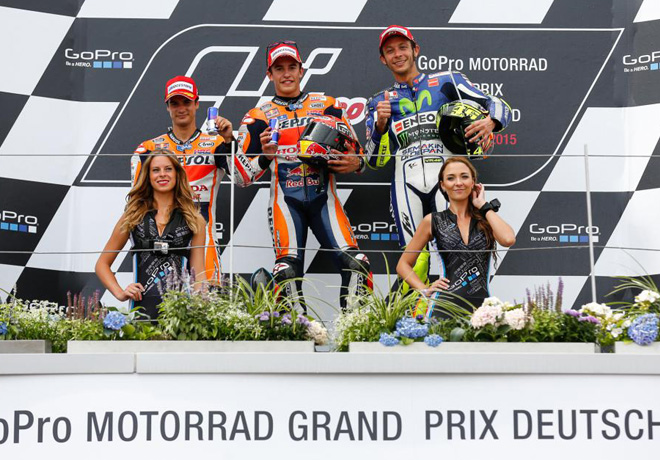 Después de seis pole position y otras tantas victorias sobre el trazado germano en diferentes categorías a lo largo de los últimos años, pocos dudaban que el campeón en título de MotoGP era el más claro favorito a la victoria después de liderar cada sesión libre o clasificatoria del fin de semana. A diferencia de Rossi o Lorenzo, Márquez se decidía por el neumático duro en el tren delantero: “Quizá con el neumático blando podría haber rodado algo mejor, pero después del warm up me sentía cómodo”, comenzaba explicando el campeón en título. “Estoy feliz porque este fin de semana he sido primero todo el tiempo y hacía mucho tiempo que no lo conseguía. Es un buen resultado para irme de vacaciones, pero quiero seguir mejorando”, resumía finalmente.