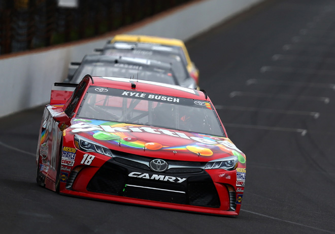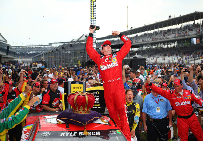 Kyle Busch (Toyota) fue el vencedor de la competencia disputada en el tradicional óvalo de Indianápolis después de 164 vueltas al mítico circuito y de haber liderado solamente por espacio de 19 giros. Segundo terminó Joey Logano (Ford), a 0,332 milésimas, y tercero Kevin Harvick (Chevrolet), quien fue el piloto que más tiempo comandó las acciones: 75 vueltas.