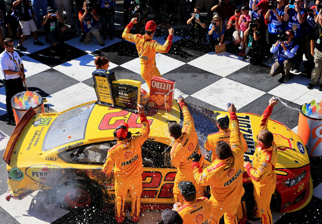 La carrera se definió sobre la misma lÃnea de llegada cuando el lÃder Kevin Harvick (Chevrolet) se quedó sin combustible y fue rebasado por Joey Logano (Ford) y Kyle Busch (Toyota), quedando finalmente tercero. Matt Kenseth (Toyota); Kurt Busch (Chevrolet); Clint Bowyer (Toyota); Brad Keselowski (Ford); Carl Edwards (Toyota); Sam Hornish Jr. (Ford) y Jimmie Johnson (Chevrolet) cerraron el lote de los diez mejores.