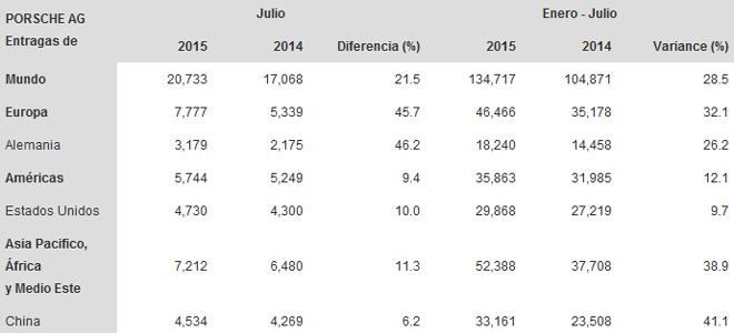 En julio de 2015 Porsche tuvo una gran acogida por parte de los clientes alemanes: con alrededor de 3.000 entregas el fabricante de autos deportivos tuvo un incremento de 46 por ciento en su mercado local en comparación con el mismo mes del año anterior. En Estados Unidos más de 4.700 nuevos autos fueron entregados a los clientes, con lo cual no solo fueron superadas 10 por ciento las entregas de julio del año pasado sino que este país se convirtió en el mercado más dinámico del mundo en julio de 2015.