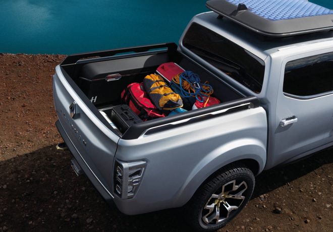 El Showcar Alaskan es una pick-up de 5 plazas, que prepara el terreno para los próximos modelos que serán de alcance global. Combina una carga de una tonelada con un estilo atlético y de vanguardia para satisfacer las exigentes demandas de usuarios tanto comerciales como individuales. Se ajusta perfectamente a las expectativas estéticas del segmento de pick-ups, al mismo tiempo permaneciendo fiel al estilo propio de la marca Renault.
