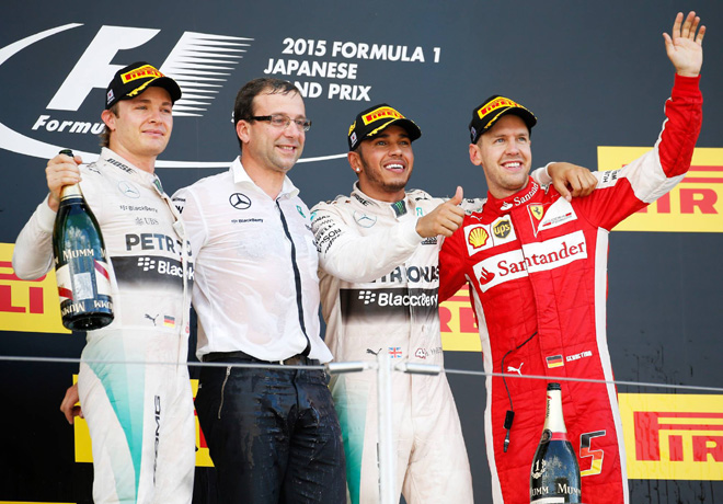 Lewis Hamilton conquistó el Gran Premio de Japón disputado en Suzuka, después de liderar de principio a fin una competencia en la que ejerció una clara superioridad sobre sus rivales. El piloto de Mercedes adelantó a Rosberg, que partía desde la pole, en la misma salida, y apenas tuvo oposición durante el resto de la carrera para conseguir su triunfo número 41 que lo equipara con el brasileño Ayrton Senna y lo ubica apenas con una competencia menos que Vettel.