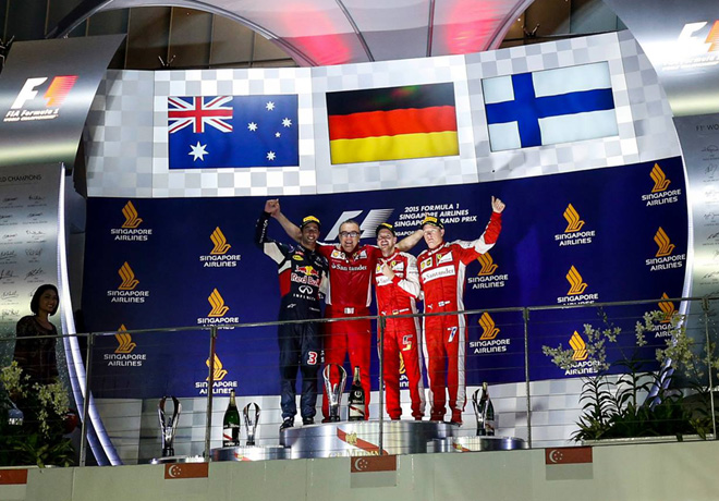 Sebastian Vettel con la Ferrari logró su tercera victoria de la temporada, en una competencia poco atractiva por el dominio del alemán, que sólo podrÃa haber peligrado su triunfo por los dos ingresos del Auto de Seguridad. Esta victoria es la número 42 de su carrera. Segundo arribó Daniel Ricciardo (Red Bull-Renault) y tercero Kimi Räikkönen con la otra Ferrari, mientras que el lÃder del campeonato, Lewis Hamilton, tuvo que retirarse con su Mercedes.