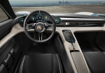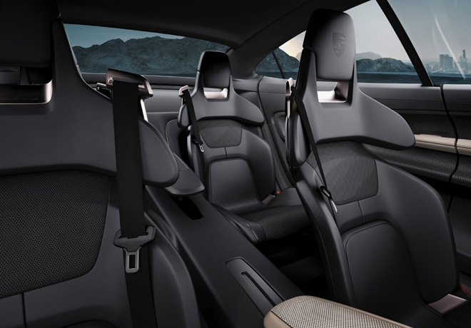 El interior del Mision E transfiere todos los tradicionales principios de diseño de Porsche en el futuro: amplitud, diseño purista, arquitectura limpia, orientación hacia el conductor y practicidad cotidiana. El concepto de accionamiento completamente eléctrico permitió reinterpretar totalmente el interior. La falta de un túnel de transmisión, por ejemplo, ofrece mayor el espacio y crea un ambiente más amplio y ligero a todo el interior. Asientos deportivos envolventes sirvieron como inspiración para los cuatro asientos individuales. Su diseño ligero reduce el peso, y les da a los ocupantes soporte lateral seguro durante la conducción dinámica. Entre los asientos delanteros se ubica la consola central –elegantemente curvada como un puente con un espacio abierto debajo de ella– se extiende hasta el tablero de mandos.