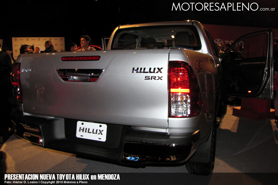 La vista trasera mantiene el criterio de diseño lateral a través de la línea superior del portón trasero, que incorpora el nuevo emblema de Hilux. Las versiones SRX, SRV y SR suman a su vez una distintiva moldura cromada que incorpora la cámara de retroceso integrada, dando así una apariencia más limpia a ese sector. El nuevo paragolpes trasero fue rediseñado para mejorar la accesibilidad a la caja de carga. Y en todas las versiones los faros traseros están posicionados de manera tal de que sean perfectamente visibles.