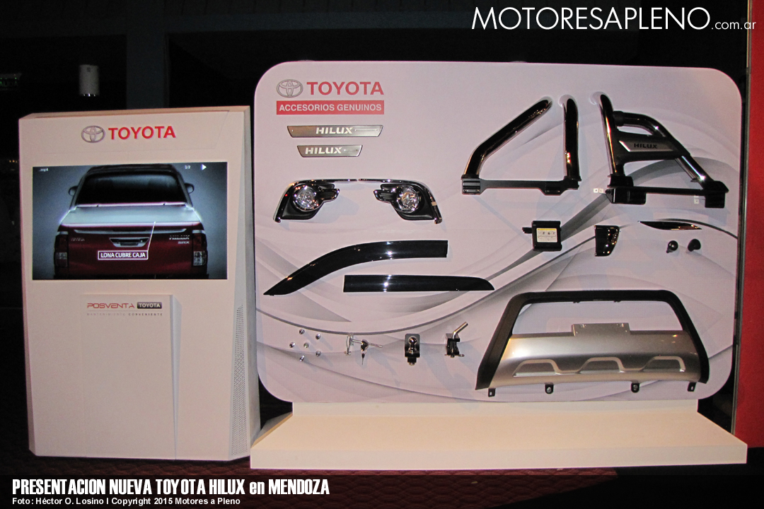 Para el lanzamiento de la 8ª generación de Hilux se desarrolló un extenso line up de 62 accesorios, entre los cuales se pueden encontrar totalmente renovados los ya considerados clásicos, como la barra de lujo; el protector frontal y el cobertor de caja entre otros. Los nuevos productos han sido concebidos con el fin de complementar a la nueva Hilux en los distintos escenarios en los cuales la utilizan los clientes. Además, se agregan a la oferta otros accesorios que permitirán personalizar la estética del vehículo según el gusto de cada usuario, permitiendo a cada pick up ser única.