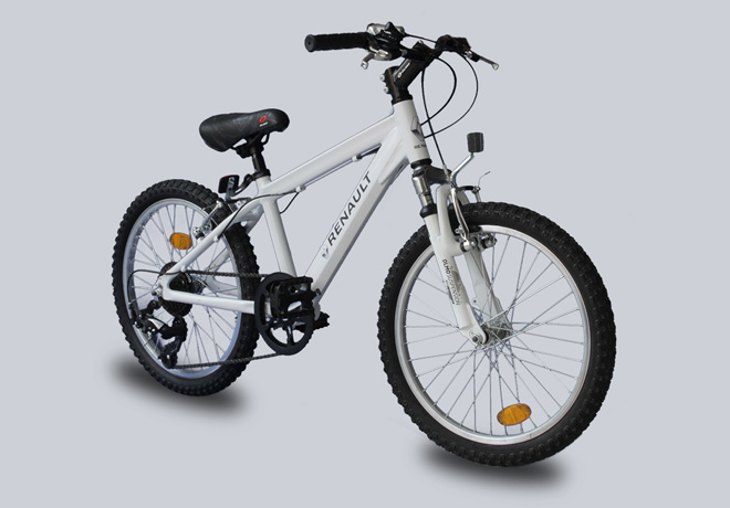 - Mountain Bike Renault Sport: El tope de gama de la lÃnea de bicicletas lleva la firma Renault Sport. Cuenta con cuadro de aluminio, frenos a disco y rodado de 26 pulgadas. Suma 27 cambios y tiene suspensión regulable. Las ruedas permiten mayor desempeño off road y, en cuanto al diseño, se destaca por el color negro en el cuadro y llantas.