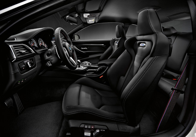 Para el BMW M3 Sedán y BMW M4 Coupé, el Competition Package incluye asientos deportivos M especiales de bajo peso que combinan soporte perfecto en condiciones de manejo extremo con un gran confort para viajes largos. Las lÃneas de M tejidas en los cinturones de seguridad coronan la deportividad del ambiente interior.