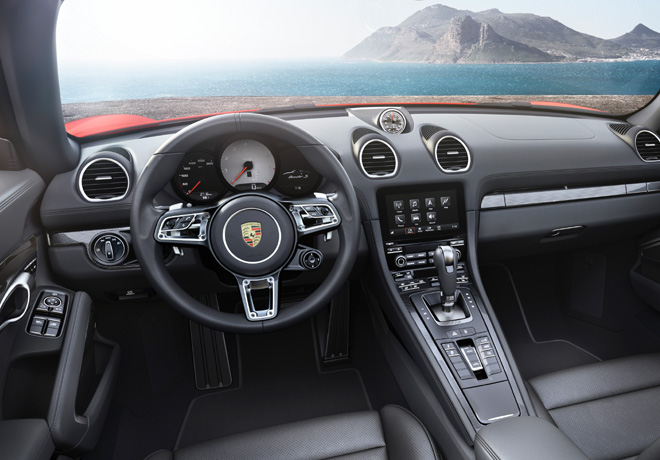 El conductor se encontrará en el habitáculo del 718 Boxster ese ambiente interior familiar de Porsche, ahora mejorado con nuevos elementos como el cuadro de instrumentos. Otro punto central de este renovado esquema interior es el Porsche Communication Management (PCM), preparado para acoplar el teléfono móvil, interfaz de audio y con Paquete de Sonido Plus, que permite una potencia de audio de 110 vatios. El PCM se puede ampliar con módulos opcionales para adaptarse plenamente a los gustos personales de cada uno. Por ejemplo, el módulo de navegación con control de voz, que hace más fácil introducir el destino deseado.