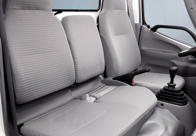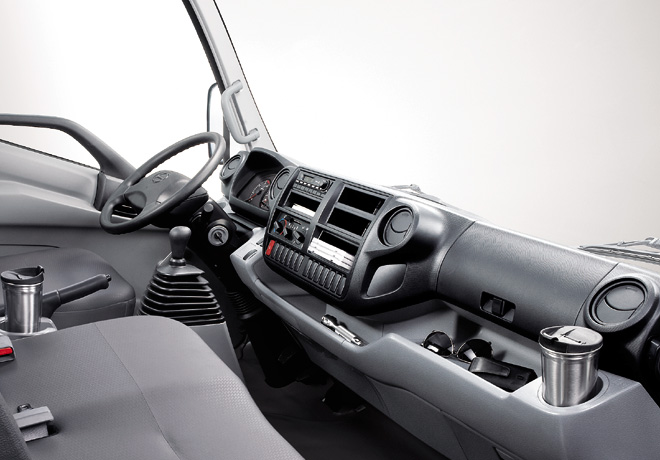 - Cabina muy luminosa: Tiene una gran superficie vidriada y el parabrisas convexo, sumado a un pilar de cabina mínimo pero muy robusto que reduce los puntos ciegos y permite el mayor ingreso de la luz exterior. La cabina frontal, típica de los camiones ofrecidos en el mercado, reduce el ángulo de visión. En cambio, las cabinas de los camiones HINO brindan mayor amplitud visual sobre la carretera, mejorando el nivel de seguridad ya que reduce la distancia de frenado, permitiendo la anticipación en un 50%.