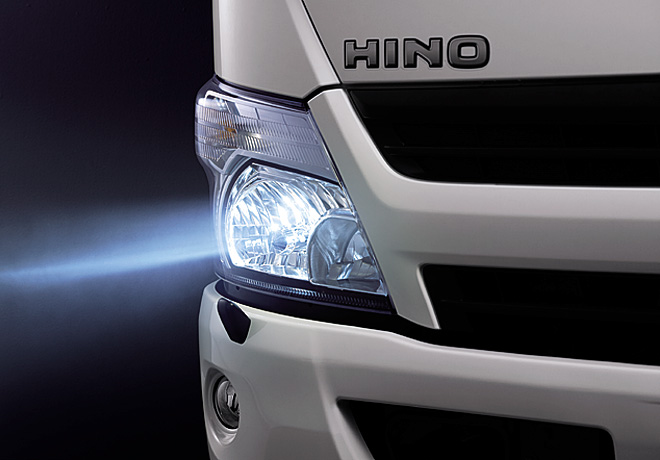 - Los faros: Una lámpara halógena produce un espectro continuo de luz que logra una luz azulada o fría que, a diferencia de las lámparas incandescentes comunes, ofrece una luminosidad superior y más efectiva. En la gama de camiones HINO, las luces halógenas altas y bajas son un equipamiento estándar. La regulación de la altura de los faros se realiza a través de un switch montando en el interior de la cabina.
