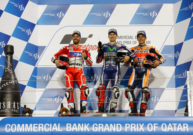 La primera ronda de la temporada en el Campeonato del Mundo de MotoGP 2016 celebrada este domingo en el Circuito Internacional de Losail, ha finalizado con la victoria de Jorge Lorenzo (Movistar Yamaha MotoGP). El piloto mallorquín subía a lo alto del podio acompañado por Andrea Dovizioso (Ducati Team) y Marc Márquez (Repsol Honda Team).